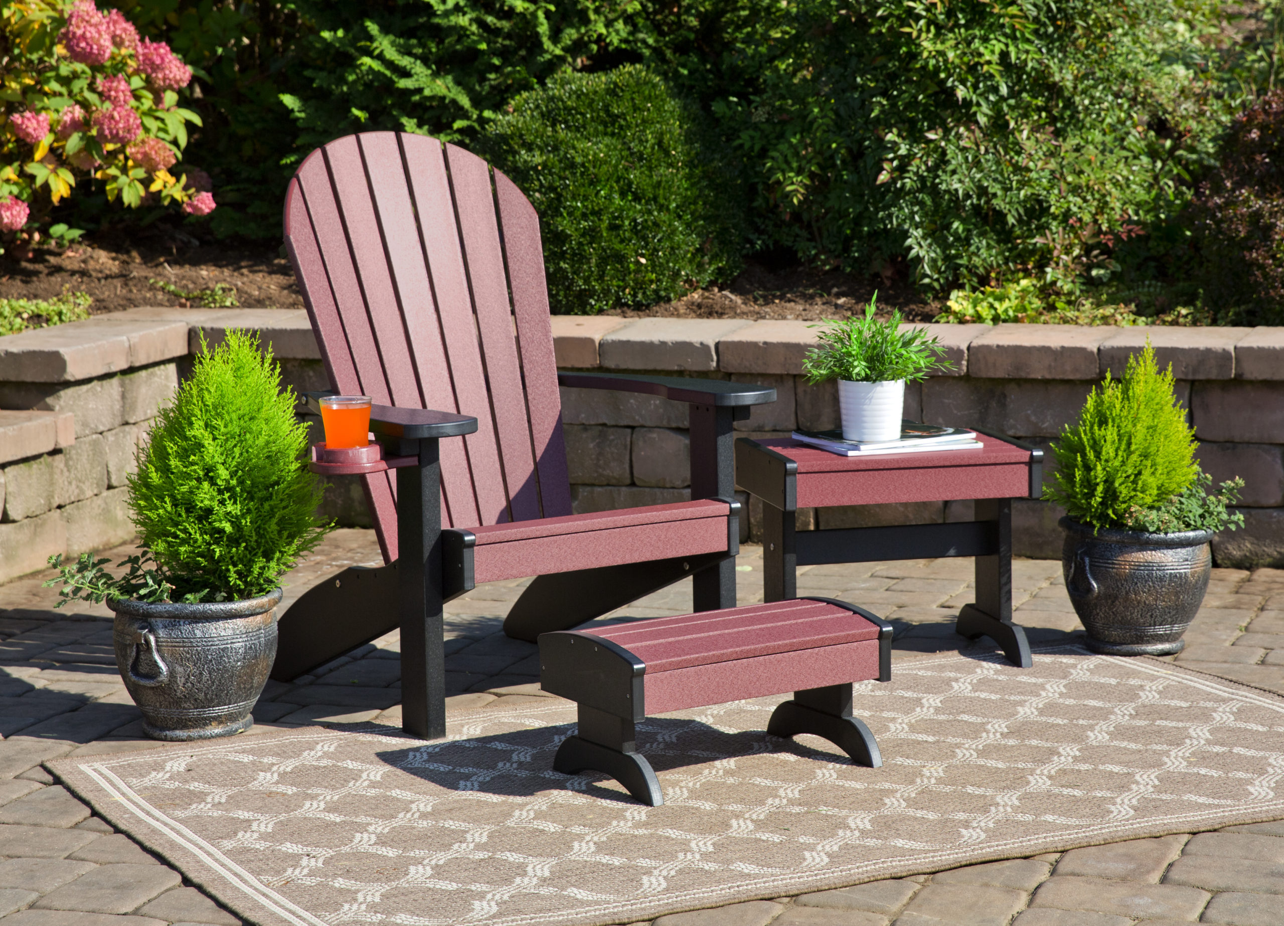 Bringing together the classic comfort and style of Adirondack furniture, this Poly Adirondack Chair Deluxe Set is proudly handcrafted with plastic from recycled milk jugs. Settling into the distinctively curved fan backs and deeply contoured seats are sure to sooth away the stress of a long day at work as you relax on your deck or patio with your feet up on the footstool, your favorite reading material on the end table, and the perfect beverage in the cup holder. The smooth graceful lines of this poly furniture combined with hidden fasteners gives this set an eye appeal that matches its comfort.